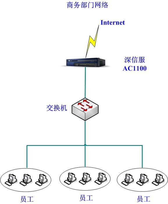 通過深信服AC1100上網(wǎng)行為管理網(wǎng)關(guān)來實現(xiàn)公司商務(wù)部門員工上網(wǎng)行為的管理、記錄、審計工作。